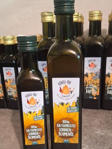Die Rinder sind in den Stall gezogen, die Hühner warten auf den ersten Schnee und im Hofladen gibt es pünktlich zu Weihnachten ein neues Produkt. Zwischen den Schauern war es doch noch möglich die Sonnenblumenkerne zu ernten und so könnt ihr jetzt ein von uns selbst erzeugtes Sonnenblumenöl erwerben. Wie auch unser Rapsöl ist es kaltgepresst und frei von Zusatzstoffen.